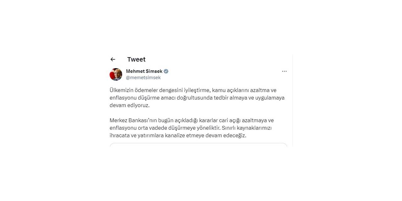 Bakan Şimşek, Twitter hesabından açıklamada bulundu. Şimşek, "Ülkemizin ödemeler dengesini iyileştirme, kamu açıklarını azaltma ve enflasyonu düşürme amacı doğrultusunda tedbir almaya ve uygulamaya devam ediyoruz. Merkez Bankası'nın bugün açıkladığı kararlar cari açığı azaltmaya ve enflasyonu orta vadede düşürmeye yöneliktir. Sınırlı kaynaklarımızı ihracata ve yatırımlara kanalize etmeye devam edeceğiz" ifadelerini kullandı. (DHA)